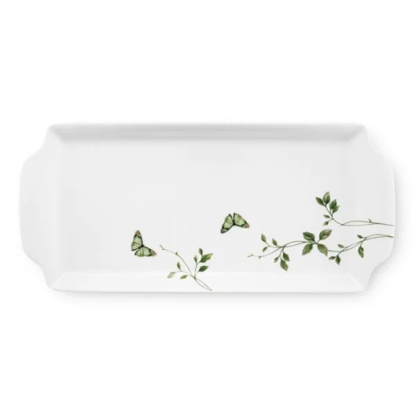 Prostokątny półmisek - taca na ciasto o boku 36 cm, wykonany z białej porcelany, dekorowany subtelnym motywem roślinnym i złotą linią.
