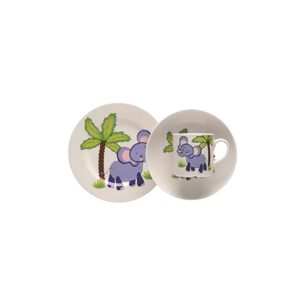 3-elementowy zestaw śniadaniowy dla dziecka z motywem słonia. Wyprodukowany z wysokiej jakości białej porcelany przez Zakłady Porcelany Lubiana.