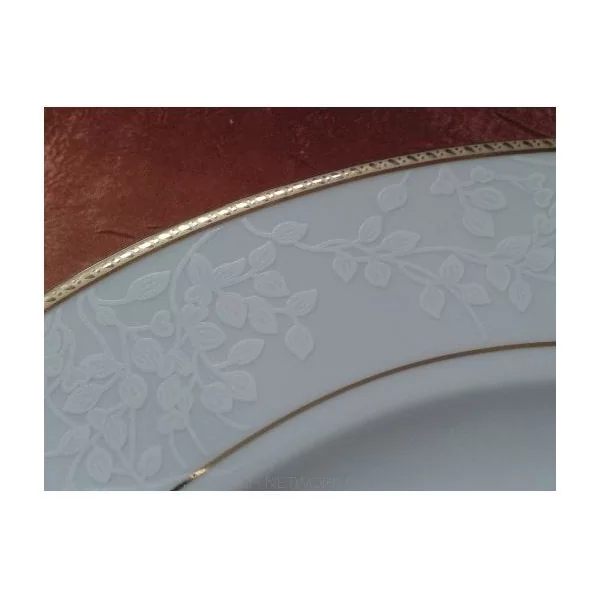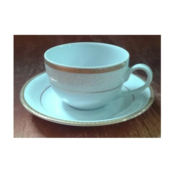 Garnitur do herbaty z białej porcelany w klasycznym, okrągłym kształcie. Skrzydła talerzy ozdobione są złotą obwódką oraz drobnymi listkami w kolorze białym.