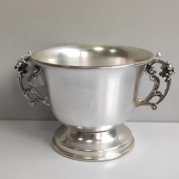 Posrebrzana okrągła cukiernica ze zdobionymi uchwytami.