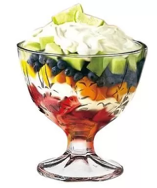 Komplet 6 pucharków na nóżce, ozdobionych szlifem niedużych gwiazdek. Salaterki mają pojemność 250 ml, średnica miseczki na górze wynosi 10 cm. Idealnie sprawdzą się jako pojemnik do serwowania lodów i słodkich deserów.