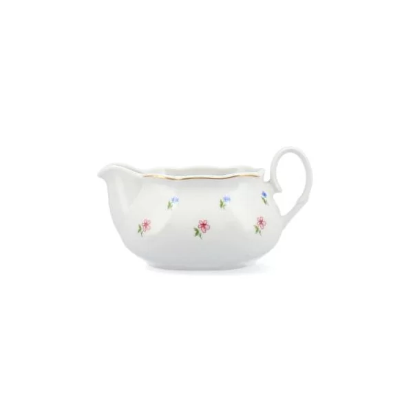 Porcelanowa sosjerka z delikatnym motywem kwiatowym oraz złotym paskiem. Wykonana z białej porcelany. Producent Lubiana.