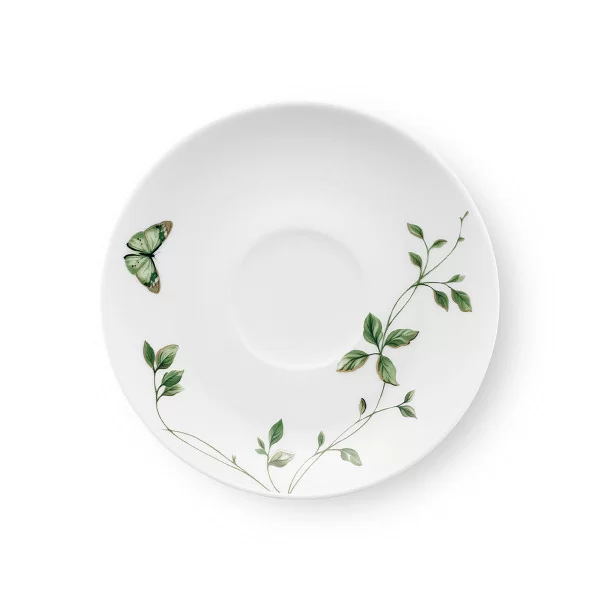 Spodek pod filiżankę o średnicy 16 cm, wykonany z białej porcelany, dekorowany subtelnym motywem roślinnym i złotą linią.