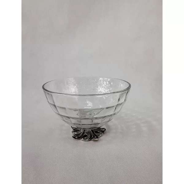 Szklana salaterka na posrebrzanej nodze, pięknie prezentuje się na stole. Idealnie nadaje się na ciastka, owoce, jako efektowna dekoracja albo jej element.