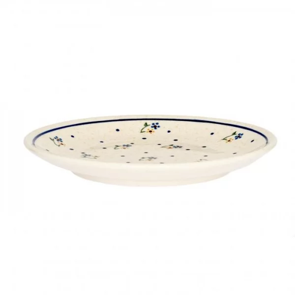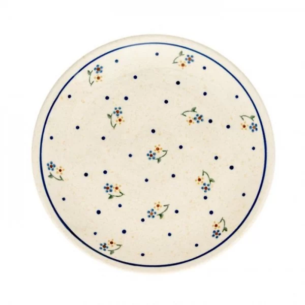 Ceramiczny talerz o średnicy 19,5 cm, dekorowany w drobniutkie niczym niezapominajki kwiatki, kobaltowe kropki oraz linie na obrzeżach. Kolekcja klasyczna Zakładów Ceramicznych Bolesławiec.