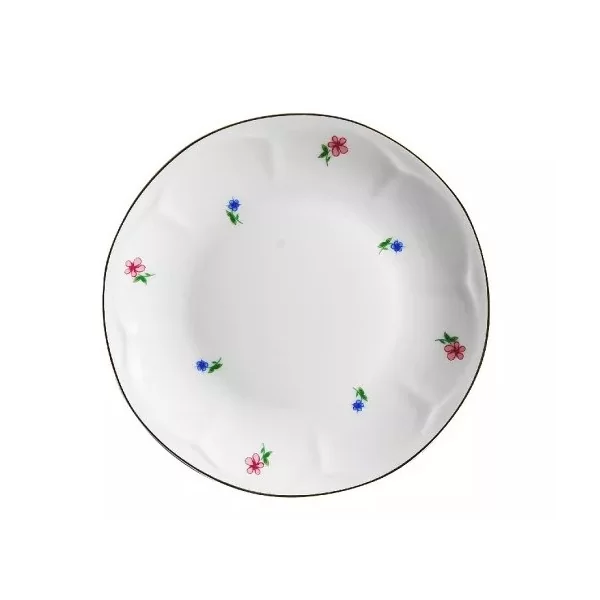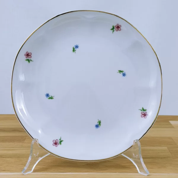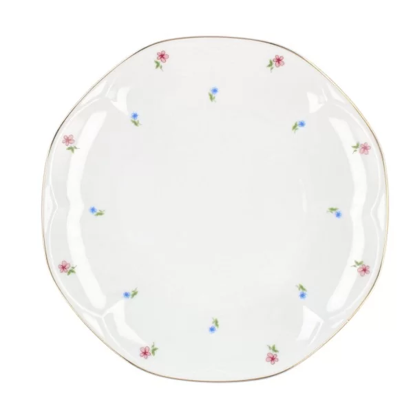 Talerz przekąskowy o średnicy 19 cm z delikatnym motywem kwiatowym oraz złotym paskiem. Wykonana z białej porcelany. Producent Lubiana.