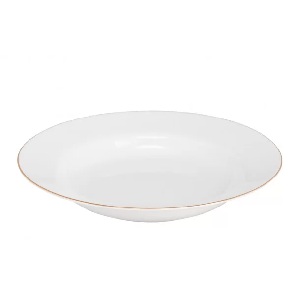 Talerz głęboki do zupy, ze skrzydłem, o średnicy 23 cm. Porcelana biała dekorowana złotą linią. Kolekcja Planet Gold produkowana na naszą wyłączność przez ZPS Karolina.