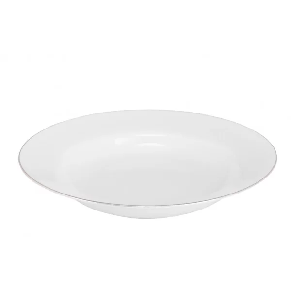 Talerz głęboki o lekko zakrzywionym skrzydle. Niezwykle elegancki talerz do serwowania tradycyjnych zup lub zup kremów. Wykonany z białej porcelany z delikatnym, eleganckim zdobieniem w postaci srebrnego paska. Talerz sprawdzi się w użytku co dziennym jak również podczas rodzinnych uroczystości.