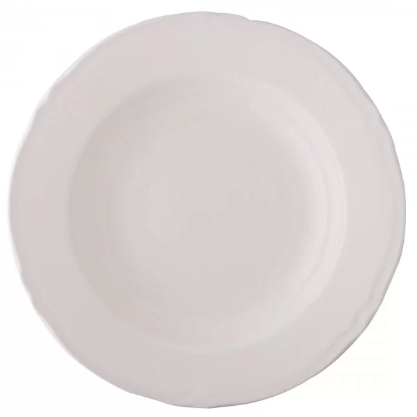 Talerz głęboki o średnicy 23,5 cm. Wykonany z niedekorowanej porcelany w kolorze ecru.