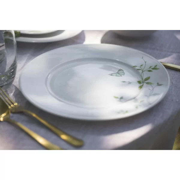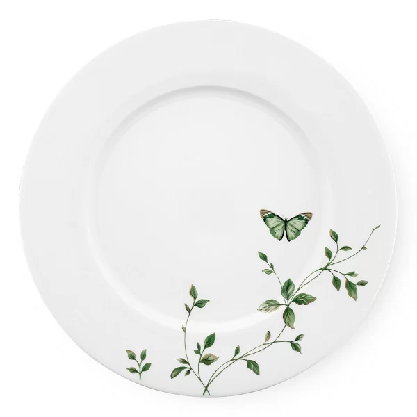 Kultowy fason Margaret porcelany Ćmielów odtworzony został na podstawie projektów autorstwa cenionego artysty Wincentego Potackiego, który przez wiele lat był związany z tą fabryką porcelany. Margaret w dekoracji Magiczny Ogród to klasyczna, śnieżnobiała porcelana zdobiona subtelnymi, roślinnymi elementami w odcieniach zieleni, z ręcznie malowaną złotą linią wokół brzegów naczyń. Dekorację G665 tworzą ciemnozieloneliście z połyskującymi, ręcznie malowanymi, złotymi detalami oraz uroczy motyl, który również uwydatniony jest wysokokaratowym złotem.
