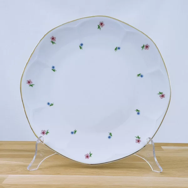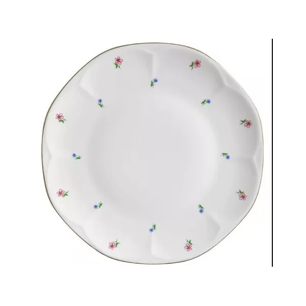 Talerz obiadowy o średnicy 26 cm z delikatnym motywem kwiatowym oraz złotym paskiem. Wykonana z białej porcelany. Producent Lubiana.