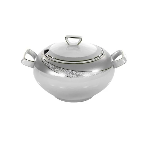 Waza do serwisu obiadowego Yvonne Tezeo, o pojemności 3 litry. Zdobiona jest kalką oraz delikatnymi platynowymi liniami.