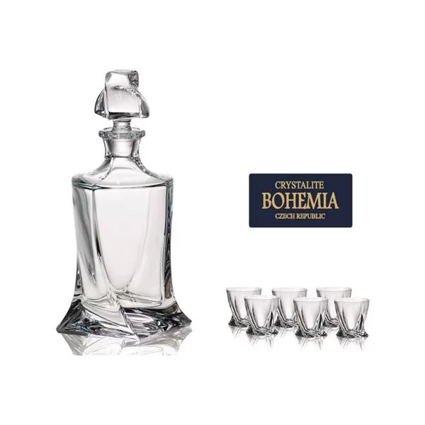 Komplet do wódki wykonany ze szkła kryształowego. W skład zestawu wchodzi karafka i 6 kieliszków typu shot. Komplet pochodzi z kolekcji Quadro czeskiej marki Bohemia Crystalite Glass.