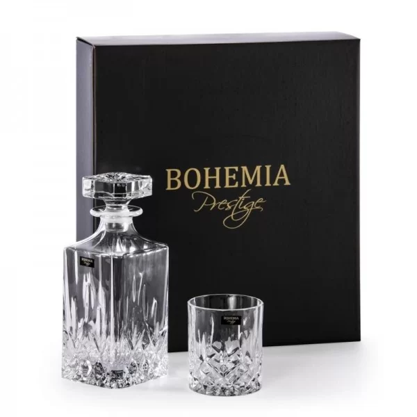 Elegancki komplet z kryształu, karafka i 6 szklanek do whisky linia PRESTIGE. Producentem wyrobu jest Bohemia z Czech.